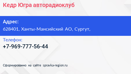 Кедр-Югра, авторадиоклуб по адресу 628401, Ханты-Мансийский АО, Сургут, в дальнейшем Организация, размещена в следующих категориях: