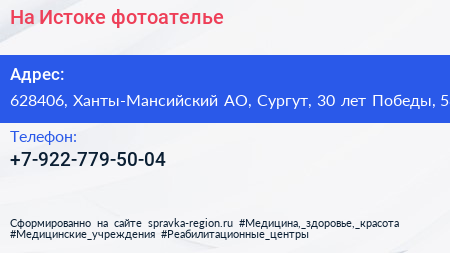 На Истоке, фотоателье по адресу 628406, Ханты-Мансийский АО, Сургут, 30 лет Победы, 58 в дальнейшем Организация, размещена в следующих категориях: