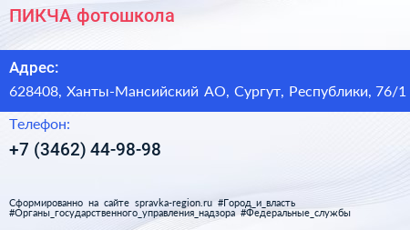 ПИКЧА, фотошкола по адресу 628408, Ханты-Мансийский АО, Сургут, Республики, 76/1 в дальнейшем Организация, размещена в следующих категориях: