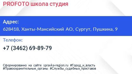 PROFOTO, школа-студия по адресу 628418, Ханты-Мансийский АО, Сургут, Пушкина, 9 в дальнейшем Организация, размещена в следующих категориях:
