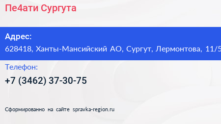 Пе4ати Сургута по адресу 628418, Ханты-Мансийский АО, Сургут, Лермонтова, 11/5 в дальнейшем Организация, размещена в следующих категориях: