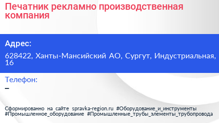 Печатник, рекламно-производственная компания по адресу 628422, Ханты-Мансийский АО, Сургут, Индустриальная, 16 в дальнейшем Организация, размещена в следующих категориях: