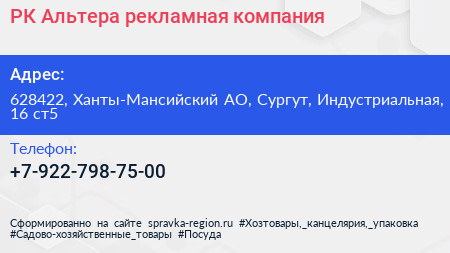 РК-Альтера, рекламная компания по адресу 628422, Ханты-Мансийский АО, Сургут, Индустриальная, 16 ст5 в дальнейшем Организация, размещена в следующих категориях: