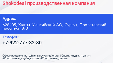 Shokodeal, производственная компания по адресу 628405, Ханты-Мансийский АО, Сургут, Пролетарский проспект, 8/3 в дальнейшем Организация, размещена в следующих категориях:
