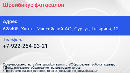 Шрайбикус, фотосалон по адресу 628408, Ханты-Мансийский АО, Сургут, Гагарина, 12 в дальнейшем Организация, размещена в следующих категориях: