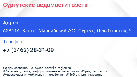 Сургутские ведомости, газета по адресу 628416, Ханты-Мансийский АО, Сургут, Декабристов, 5 в дальнейшем Организация, размещена в следующих категориях: