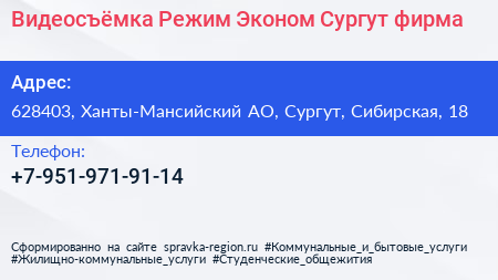 Видеосъёмка Режим-Эконом Сургут, фирма по адресу 628403, Ханты-Мансийский АО, Сургут, Сибирская, 18 в дальнейшем Организация, размещена в следующих категориях: