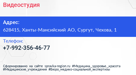 Видеостудия по адресу 628415, Ханты-Мансийский АО, Сургут, Чехова, 1 в дальнейшем Организация, размещена в следующих категориях: