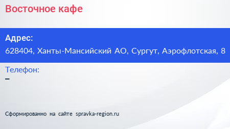 Восточное, кафе по адресу 628404, Ханты-Мансийский АО, Сургут, Аэрофлотская, 8 в дальнейшем Организация, размещена в следующих категориях: