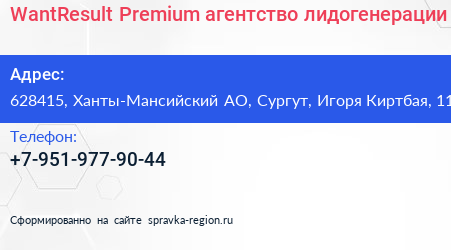 WantResult Premium, агентство лидогенерации по адресу 628415, Ханты-Мансийский АО, Сургут, Игоря Киртбая, 11 в дальнейшем Организация, размещена в следующих категориях: