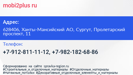 mobi2plus.ru по адресу 628406, Ханты-Мансийский АО, Сургут, Пролетарский проспект, 11 в дальнейшем Организация, размещена в следующих категориях: