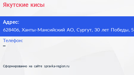 Якутские кисы по адресу 628406, Ханты-Мансийский АО, Сургут, 30 лет Победы, 58 в дальнейшем Организация, размещена в следующих категориях: