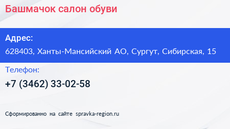 Башмачок, салон обуви по адресу 628403, Ханты-Мансийский АО, Сургут, Сибирская, 15 в дальнейшем Организация, размещена в следующих категориях: