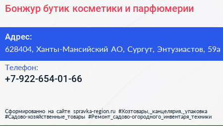Бонжур, бутик косметики и парфюмерии по адресу 628404, Ханты-Мансийский АО, Сургут, Энтузиастов, 59а в дальнейшем Организация, размещена в следующих категориях: