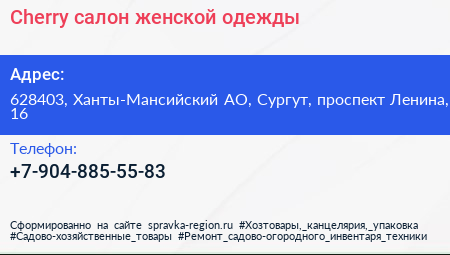 Cherry, салон женской одежды по адресу 628403, Ханты-Мансийский АО, Сургут, проспект Ленина, 16 в дальнейшем Организация, размещена в следующих категориях: