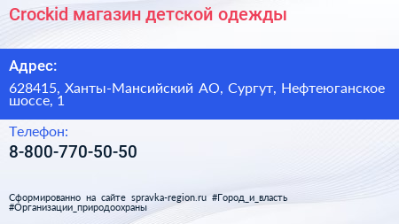 Crockid, магазин детской одежды по адресу 628415, Ханты-Мансийский АО, Сургут, Нефтеюганское шоссе, 1 в дальнейшем Организация, размещена в следующих категориях:
