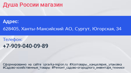 Душа России, магазин по адресу 628405, Ханты-Мансийский АО, Сургут, Югорская, 34 в дальнейшем Организация, размещена в следующих категориях: