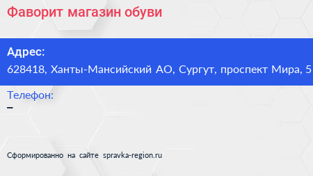 Фаворит, магазин обуви по адресу 628418, Ханты-Мансийский АО, Сургут, проспект Мира, 5 в дальнейшем Организация, размещена в следующих категориях: