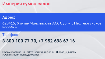 Империя сумок, салон по адресу 628415, Ханты-Мансийский АО, Сургут, Нефтеюганское шоссе, 1 в дальнейшем Организация, размещена в следующих категориях: