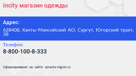 Incity, магазин одежды по адресу 628408, Ханты-Мансийский АО, Сургут, Югорский тракт, 38 в дальнейшем Организация, размещена в следующих категориях: