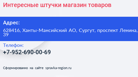 Интересные штучки, магазин товаров по адресу 628416, Ханты-Мансийский АО, Сургут, проспект Ленина, 39 в дальнейшем Организация, размещена в следующих категориях: