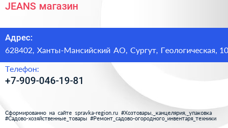 JEANS, магазин по адресу 628402, Ханты-Мансийский АО, Сургут, Геологическая, 10 в дальнейшем Организация, размещена в следующих категориях: