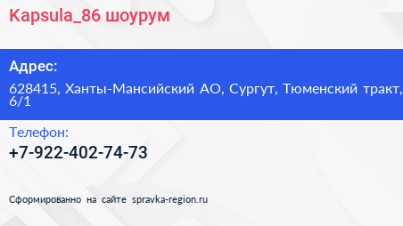 Kapsula_86, шоурум по адресу 628415, Ханты-Мансийский АО, Сургут, Тюменский тракт, 6/1 в дальнейшем Организация, размещена в следующих категориях: