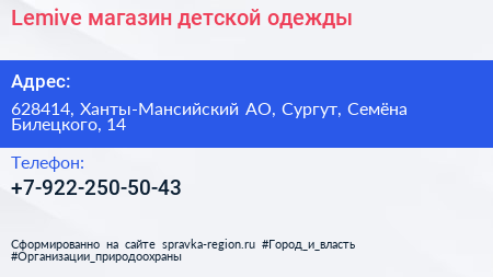Lemive, магазин детской одежды по адресу 628414, Ханты-Мансийский АО, Сургут, Семёна Билецкого, 14 в дальнейшем Организация, размещена в следующих категориях: