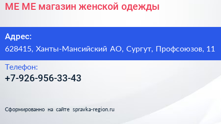 ME & ME, магазин женской одежды по адресу 628415, Ханты-Мансийский АО, Сургут, Профсоюзов, 11 в дальнейшем Организация, размещена в следующих категориях: