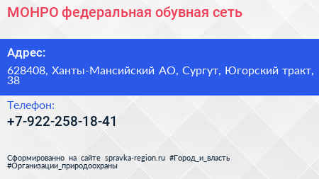 MОНРО, федеральная обувная сеть по адресу 628408, Ханты-Мансийский АО, Сургут, Югорский тракт, 38 в дальнейшем Организация, размещена в следующих категориях:
