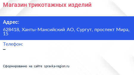 Магазин трикотажных изделий по адресу 628418, Ханты-Мансийский АО, Сургут, проспект Мира, 15 в дальнейшем Организация, размещена в следующих категориях: