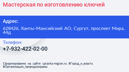 Мастерская по изготовлению ключей по адресу 628426, Ханты-Мансийский АО, Сургут, проспект Мира, 44д в дальнейшем Организация, размещена в следующих категориях: