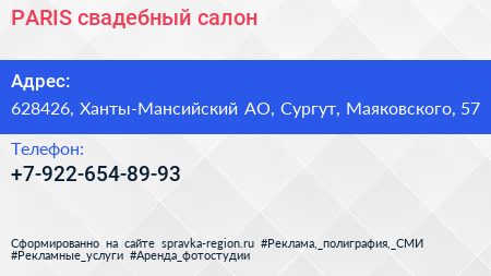 PARIS, свадебный салон по адресу 628426, Ханты-Мансийский АО, Сургут, Маяковского, 57 в дальнейшем Организация, размещена в следующих категориях: