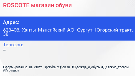 ROSCOTE, магазин обуви по адресу 628408, Ханты-Мансийский АО, Сургут, Югорский тракт, 38 в дальнейшем Организация, размещена в следующих категориях: