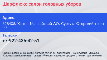 Шарфлюкс, салон головных уборов по адресу 628408, Ханты-Мансийский АО, Сургут, Югорский тракт, 38 в дальнейшем Организация, размещена в следующих категориях: