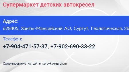 Супермаркет детских автокресел по адресу 628405, Ханты-Мансийский АО, Сургут, Геологическая, 26 в дальнейшем Организация, размещена в следующих категориях:
