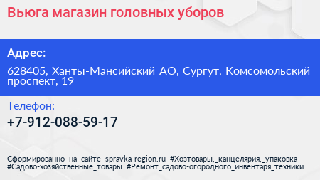 Вьюга, магазин головных уборов по адресу 628405, Ханты-Мансийский АО, Сургут, Комсомольский проспект, 19 в дальнейшем Организация, размещена в следующих категориях: