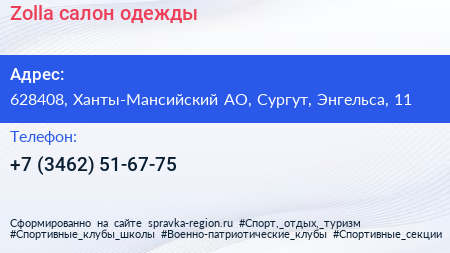 Zolla, салон одежды по адресу 628408, Ханты-Мансийский АО, Сургут, Энгельса, 11 в дальнейшем Организация, размещена в следующих категориях: