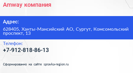 Amway, компания по адресу 628405, Ханты-Мансийский АО, Сургут, Комсомольский проспект, 13 в дальнейшем Организация, размещена в следующих категориях: