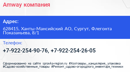 Amway, компания по адресу 628415, Ханты-Мансийский АО, Сургут, Флегонта Показаньева, 8/1 в дальнейшем Организация, размещена в следующих категориях: