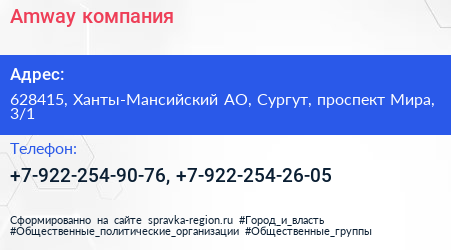 Amway, компания по адресу 628415, Ханты-Мансийский АО, Сургут, проспект Мира, 3/1 в дальнейшем Организация, размещена в следующих категориях: