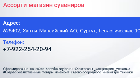 Ассорти, магазин сувениров по адресу 628402, Ханты-Мансийский АО, Сургут, Геологическая, 10 в дальнейшем Организация, размещена в следующих категориях: