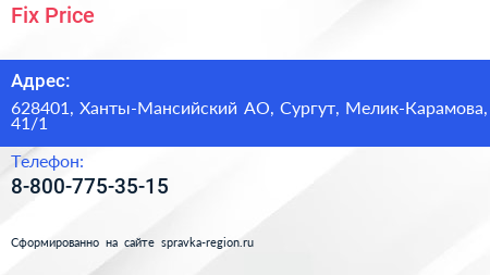 Fix Price по адресу 628401, Ханты-Мансийский АО, Сургут, Мелик-Карамова, 41/1 в дальнейшем Организация, размещена в следующих категориях: