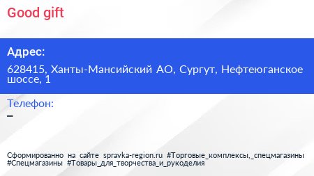 Good gift по адресу 628415, Ханты-Мансийский АО, Сургут, Нефтеюганское шоссе, 1 в дальнейшем Организация, размещена в следующих категориях: