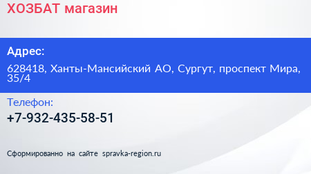 ХОЗБАТ, магазин по адресу 628418, Ханты-Мансийский АО, Сургут, проспект Мира, 35/4 в дальнейшем Организация, размещена в следующих категориях: