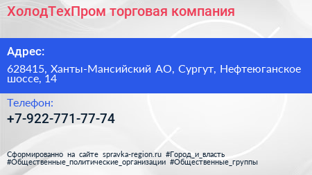 ХолодТехПром, торговая компания по адресу 628415, Ханты-Мансийский АО, Сургут, Нефтеюганское шоссе, 14 в дальнейшем Организация, размещена в следующих категориях: