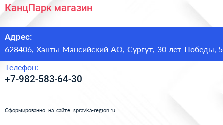 КанцПарк, магазин по адресу 628406, Ханты-Мансийский АО, Сургут, 30 лет Победы, 50 в дальнейшем Организация, размещена в следующих категориях: