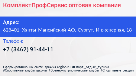 КомплектПрофСервис, оптовая компания по адресу 628401, Ханты-Мансийский АО, Сургут, Инженерная, 18 в дальнейшем Организация, размещена в следующих категориях: