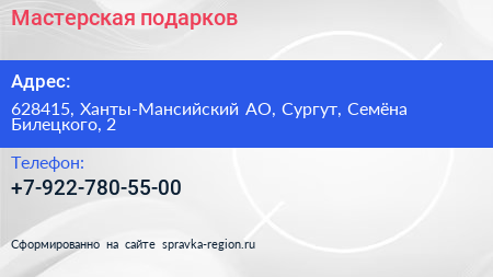 Мастерская подарков по адресу 628415, Ханты-Мансийский АО, Сургут, Семёна Билецкого, 2 в дальнейшем Организация, размещена в следующих категориях: