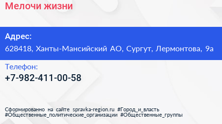 Мелочи жизни по адресу 628418, Ханты-Мансийский АО, Сургут, Лермонтова, 9а в дальнейшем Организация, размещена в следующих категориях:
